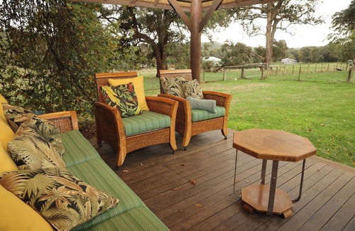 The deck overlooks the large backyard and beyond to the hills and dam. Sitting on the super comfy refurbished lounge in the Balinese gazebo you can watch ducks wander up and listen to the many native birds nesting in the trees.