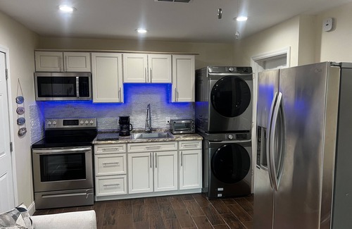 The suite is comprised of a large master with a private full bath and tub. Additionally you get a large living room with a queen size sofa bed with a full kitchen and full size front load washer and dryer. Also included is a large 65"TV. For safety Pool is not included.
