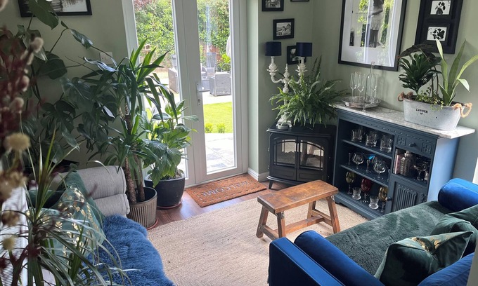 The garden room has patio doors that lead into a large enclosed garden (perfect for your dog) with patios and several seating and eating areas.