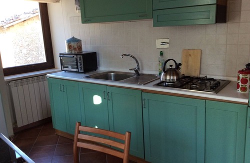 The studio apartment is the upper floor of a detached house on the edge of the village of Collimento. Park in the village and then after a few minutes winding your way through the cobbled streets and under the arches you find the house overlooking the peaceful valley. The house was originally built as a live-in stable: humans on the upper floor and animals on the lower. Today there's a covered terrace and an open plan living space with wooden beams and a terracotta floor. The apartment is ideal for a couple (one double bed) with an additional single bed on the mezzanine floor (suitable for an older child/teenager/adult). The kitchen has a full size fridge/freezer, hob and washing machine. Unfortunately the position of the apartment could be difficult to navigate for anyone with mobility issues.