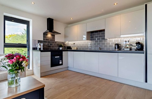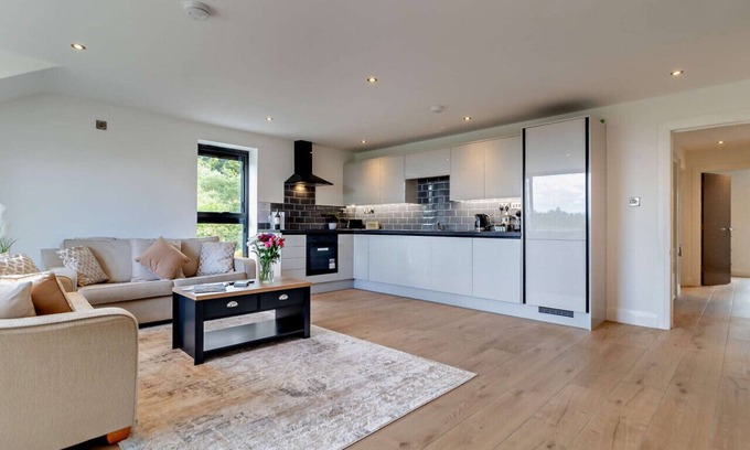 Step into this elegant first-floor apartment where an open-plan living, kitchen, and dining space awaits. Flooded with natural light, this area is perfect for entertaining or relaxing after a busy day. The modern kitchen is fully equipped and has ample storage, catering to all your culinary needs. Meals can be enjoyed together around the dining table and there are two comfy sofas to snuggle up on in front of the Smart TV. The apartment can cater for up to six guests across three bedrooms. The main bedroom features a king-size bed with an en-suite shower room, offering privacy and indulgence. Two additional double bedrooms provide ample space for guests or family members, with convenient access to a shared family bathroom.