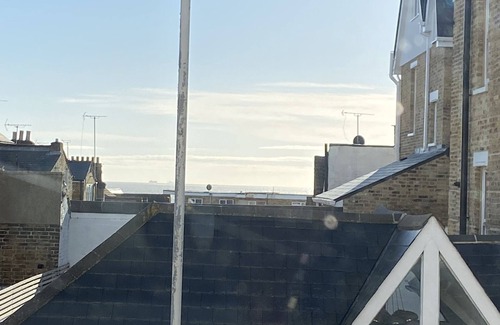This comfortable and cozy 1920 semi detached house is just a stone’s throw from the sea and is just a 10 minute walk to the royal harbour, sandy beaches (and the town centre), where you will find many bars and restaurants. The well run and largest Wetherspoons in the UK, with its beach front outdoor decks can also be found in the harbour. On the ground floor of the house, there is a cosy lounge with a log burner. The sofas are electric recliners. There is a 43” Smart TV. Virgin super fast fibre broadband (350mbps)is provided together with Virgin 360 TV (pause, rewind and record),access to catch up TV and your Amazon Prime and Netflix accounts if required. There is a separate dining room with period range (non working). A Bose Bluetooth dock is provided for music. There is a small but well equipped kitchen with access to a small shower and WC( main bathroom is upstairs) Outside is a lovely secluded and fenced court yard with comfortable furniture to relax and dine in warmer weather. Upstairs boasts a lovely large master bedroom that has sea glimpses, period features, Smart TV and a super king bed. The second bedroom has a double bed. On this floor is a large bathroom complete with a roll top free standing bath. There is free off street parking with ample availability in the road or the surrounding streets. The lovely town of Broadstairs is a 35-40 minute cliff top walk to the East and Pegwell Bay is equidistant to the west. The cliff tops boast wide promenades with good marked cycle tracks. If you wish to stay without a car, there are excellent local bus services including the “Loop” bus which serves all of the local towns, including Broadstairs, Cliftonville and Margate and runs very frequently (usually every 8 minutes). Also serviced by the Loop bus is the large Westwood Cross retail park and the QEQM hospital.. The train station is just under a mile from the house.