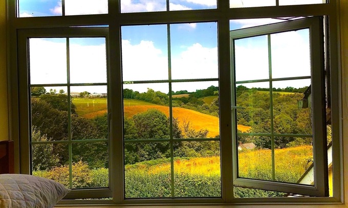 The views are beautiful and guests are welcome to explore the gardens which include streams and woodland. Younger guests will enjoy the trail to our forest camp and are welcome to make a campfire on the site as long as they put it out afterwards. Guests will be able to completely relax and enjoy the peaceful Devon countryside. There are two other houses on the property but the cottage garden is completely private and all the bedrooms enjoy spectacular views of the surrounding hills. Please note that the garden is not secured for dogs. Though the cottage is clean and functional, we are planning some interior and exterior work as it is scruffy in places and there are plumbing quirks such as the washing machine exit pipe is fixed to downstairs sink as couldn’t be plumbed in! But it all works! There are some areas of the garden close to the other houses that are private but this will be clearly marked and/or explained to you but for the most part you are welcome to wander at your leisure. Please note that most mobile networks have patchy signal here but we have fast wifi available in all areas of the cottage.
