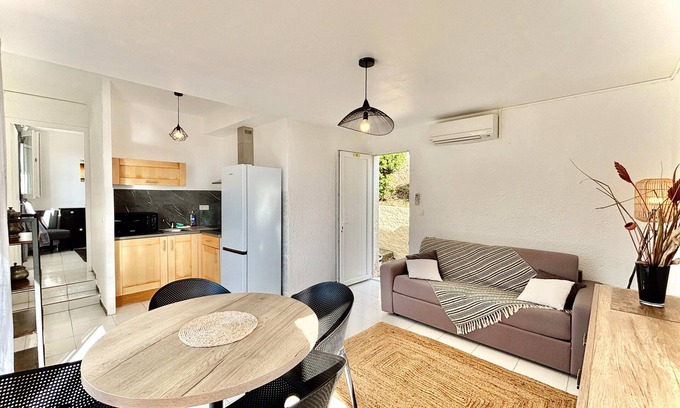 This T2 villa, ideal for 4 guests (as a couple or with friends), offers a peaceful setting with a pleasant sea view from the terrace, overlooking the garden and surrounding nature. Enjoy the sunrise over the sea in the morning and unwind in the evening facing the Corsican horizon.