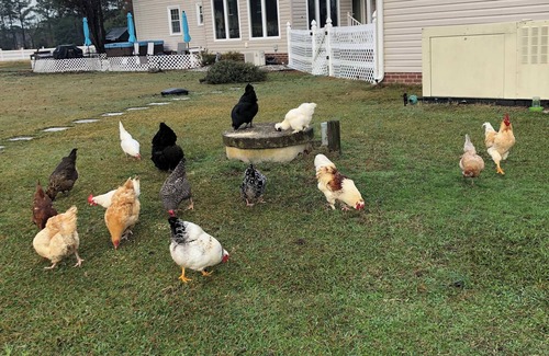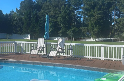 Available to rent is a cosy studio which can sleep four (2 twins, 1 full). There is a small bathroom with a shower. It is over a detached garage with its own entrance on our small farm. Plenty of parking. Has Internet and smart TV, a microwave, coffee maker, and small fridge. If mobility is an issue, you should be aware the apartment is up a flight of ten carpeted stairs. We are in the southernmost part of Eastern VA a short drive to Sandbridge and the VB Boardwalk. We're also just an hour from Kitty Hawk and the Outer Banks. We have a good size above ground pool you are welcome to use. Beautiful, quiet country neighborhood where you can see so many stars at night - and with free music from our roosters! Let us share our Southern hospitality with you.