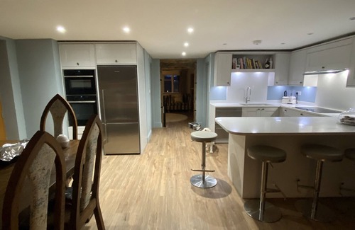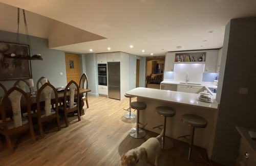 This house works well for families and couples as each bedroom has its own facilities. On the ground floor is a beautiful open plan kitchen dinner with a vaulted ceiling over a grand solid oak dining table. The kitchen has a fridge freezer, two ovens and a large hob. The lounge has a fabulous inglenook fireplace with wood burning stove and sumptuous velvet sofa seating. There is parking at the rear of the house for 3 vehicles . Pets are welcome, but we do request they do not sit/sleep on the furniture. A downstairs WC and a utility room completes the accommodation .