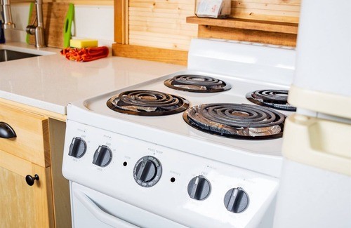 The kitchenette features a stove/oven, refrigerator, freezer, microwave, toaster, and a Keurig Duo coffee maker plus all the basic utensils, plates, cups etc.