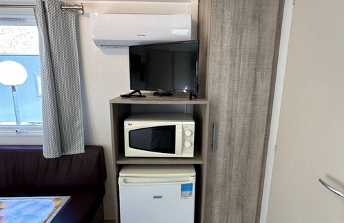 Air-conditioned accommodations at Cottage 2 Mobilhome 2 Zimmer Unterkunft für 2 Erwachsene + 1 Kind auf Ecksofa offer coffee/tea makers and hair dryers. Kitchens or kitchenettes offer refrigerators, stovetops, microwaves, and separate dining areas.