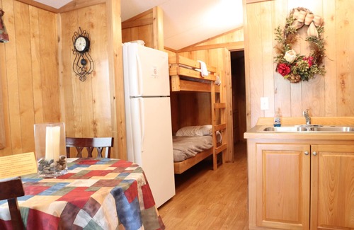 Our cozy Tiny Cabin #21 with 550 sq. ft. comfortably sleeps 4 guests.