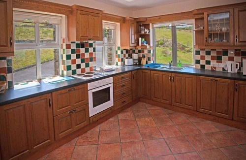 3 Bedrooms – Sleeps 6. Bedroom 1 is a twin room with 2 single beds (ground floor). Upstairs Bedroom 2 has a double bed and ensuite shower. Bedroom 3 has a double bed and ensuite shower. The large country style kitchen is bright and well equipped with all modern conveniences including microwave, kettle, toaster, dishwasher, cooker with electric hob and oven. A separate dining room with table and chairs to seat 6 offers spectacular views of the mountains and the sea. A separate utility room with fitted cupboards and worktop has a washer/dryer, iron and ironing board. The living room has comfortable seating for 6 people along with an open fire. The views from this room are fantastic. The main family bathroom has a bath with overhead shower, WC and sink. Oil fired central heating throughout property. Ample on-site parking is available. Electricity and heating is metered and payable on usage. This is paid directly to the owner/caretaker on departure. Towels and linens are included. Wifi. No pets. Cot and high chair available on request. Garden Furniture.