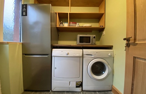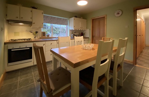 The kitchen includes the dining area with large dining table and dining seating for six persons. The kitchen equipment includes electric oven, gas hob, kettle, toaster, and Dolce Gusto coffee machine. The adjoining utility room houses a microwave, fridge freezer and a washing machine and tumble dryer. The living room includes comfortable modern furniture, open fire, and multi-channel smart TV, and offers views of the surrounding countryside, boglands and Errisbeg hill in the distance.