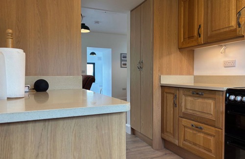 The welcoming entrance porch leads into a light and spacious combined living space, including a dining area with table and ample dining seating for six people, and a sitting area with a large couch, armchairs, and a large flat screen TV. This space is flooded with natural light and offers views on to the front of the property. The adjacent country cottage style kitchen is well equipped with all necessary equipment including a fridge freezer, dishwasher, microwave, kettle, toaster, coffee maker, and a combined electric cooker with hob and grill. A utility area, including washing machine and tumble dryer are also located just to the side of the kitchen, close to the back door of the cottage.
