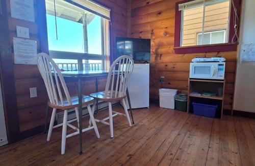 Inside the cabin, you'll find a warm, rustic ambiance created by rich wooden walls and floors. The cozy bedroom features a comfortable queen bed and two windows that let in natural light. The living area is equipped with a Smart TV and a simple dining setup with a wooden table and chairs. This compact yet inviting space is perfect for a seaside retreat.