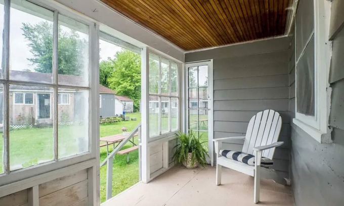 Cottage #7 at the Stow Cottages at Chautauqua - This cottage is settled directly on beautiful Chautauqua Lake! Part of the Stow Cottages at Chautauqua, our mini resort has a beautiful lakefront lawn, private boat docks, fire pits, picnic tables, and even a little beach where you can dip your toes into the water! Sweet and cozy, Cottage #7 has one private bedroom that was updated in 2025 and features one kind sized bed. The living area offers additional sleeping space with one twin sized daybed with twin trundle. The bathroom was completed renovated in 2025. The full kitchen area has a small dining table, and a private enclosed porch is a wonderful place to enjoy your morning coffee! We are located just steps from the historic Stow Ferry, which provides convenient (and quaint) access to Bemus Point for dining and shopping.