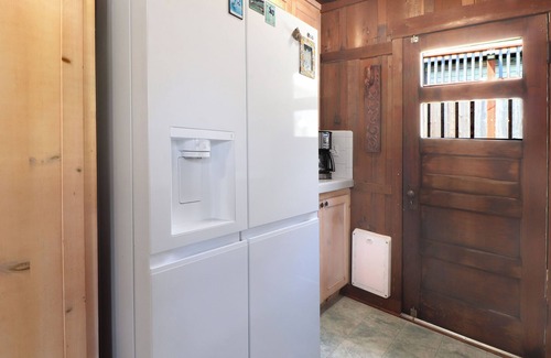 On cooler evenings, stay warm by the propane stove. The kitchen is fully equipped with modern appliances, including a fridge with ice maker, dishwasher, oven/range/microwave, and a coffee maker.