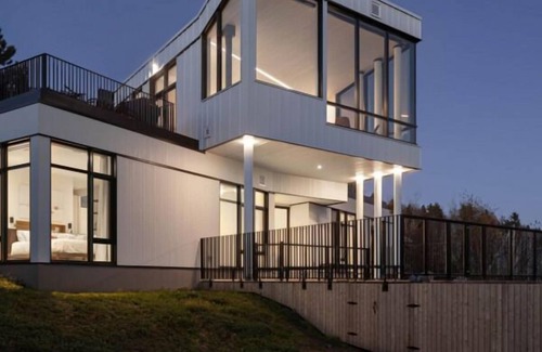 Two heaped blocks of ice lie in the clearing. Abandoned by the torrent, marked by trials, vulnerable to the onslaught of the sun, they merge and embrace in a final embrace. Sometimes crystalline, sometimes fluffy, their whiteness celebrates light, their transparency evokes their distant source. Hints of tundra, promises of life, cover the peaceful blocks with their eiderdown. This house is intended to be a tribute to Nordicity and its thousand-fold essential conquest. Bernard Serge Gagne, architect, ABCP The ascent of the hill, then the staircase of the house, allows these impressive views of the river, the estuary of the Malbaie River and the Mont des Eboulements. This luxury contemporary house located in Cap-a-l'aigle (La Malbaie) offers a unique stay experience. Upstairs, the heart of the house, housed between the evening terrace and the morning terrace, offers panoramic views of the exceptional setting of Charlevoix. Dining room, kitchen and living room spread out under a whitewashed wood ceiling. On the rear side, a boudoir offers a place to relax on the forest side. On the garden level, nestled under the upper volume in the privacy of the clearing, the swimming pool, the terrace and the spa offer a pleasant place of relaxation, protected from the wind, bathed in sunlight. The bright rooms also benefit from the privacy of the undergrowth. The signatory of the contract must be aged 30 or over.