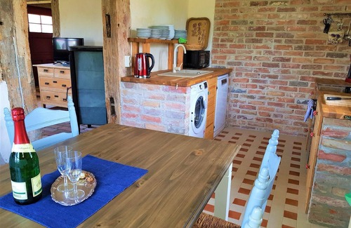 The small, 750-year-old fishing village of Altwarp is located on a peninsula on the German side of the Szczecin Lagoon, not far from the seaside resort of Ueckermünde and only about 13 kilometres from the Baltic Sea as the crow flies. Our holiday guests are surrounded by lots of water with countless natural beaches and its famous, large inland dunes and the special, pleasant sea air in this former climatic and spa resort. The fishing village is located directly on the lagoon, so you have an excellent distant view of the islands of Usedom and Wollin. Directly adjacent to the dunes is the historic, thatched fisherman's cottage "Lütt Hauke", which was renovated in 2019. It was built around 1750 in the traditional Pomeranian half-timbered style. Simple fishermen's houses are half-timbered houses with thatched or reed roofs, as they are called here, and are characteristic of the style of the lagoon coast.
