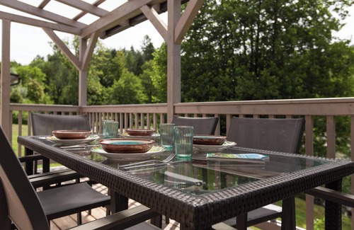 The covered terrace with garden furniture offers a beautiful view of the natural pond, creating a peaceful atmosphere to relax and enjoy the surroundings. You will also benefit from free Wi-Fi, and there is a parking space for one car at the accommodation.