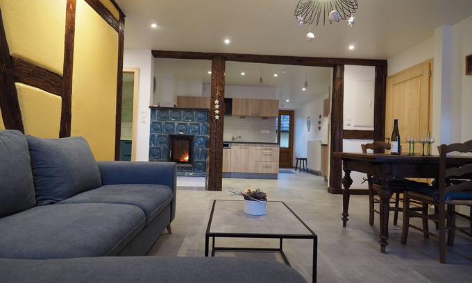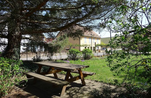 The 72m2 apartment on the ground floor has 2 bedrooms for 2 people, a living room with fully equipped kitchen area (ceramic hob, multifunction oven, microwave, dishwasher, fridge, toaster). , coffee maker and electric kettle), a bathroom with walk-in shower and washing machine, separate WC. Central heating with fuel and wood and for the pleasure of an outbreak, the living room has an old Alsatian tiled stove, wood is provided by the owner. WiFi internet access.