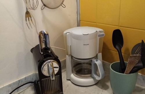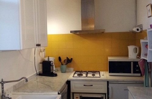 The bedroom consists of a 140 cm bed, cupboard and chest of drawers. A kitchen area with gas oven and 4 gas burners, microwave oven, dishwasher, electric coffee maker. Hair dryer and iron. Washing machine to share. TV, Internet via WiFi.