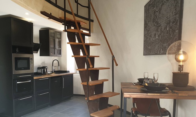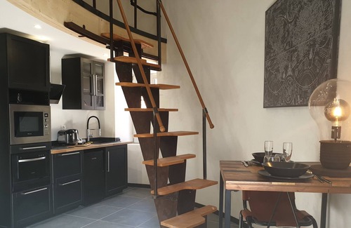- A sleeping area with a queen size bed, TV and office area on a mezzanine (accessible by a staircase of millwright wrought iron and beech)