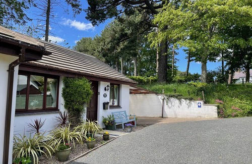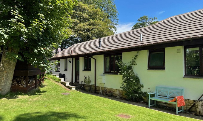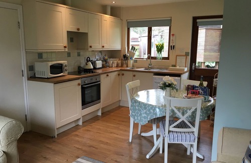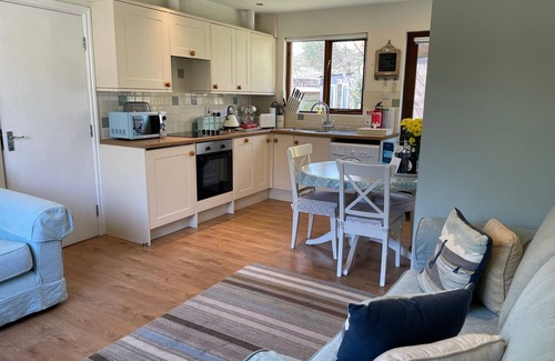 The open plan lounge kitchen/diner is spacious, with comfortable seating and a round dining table that seats four. A door opens onto the wonderful secluded woodland garden