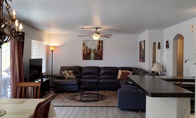 Great location in the Cottonwood Crossing residential community in Gilbert off of Greenfield and Warner. This home features a split floor-plan, is fully furnished and right next to the secluded community park with easy access to the water canal for walking or biking. Close to all kinds of shopping centers including San Tan Village Mall. remodel in 2020 and looks great. no pics yet. Furnishings include washer, dryer, and 58 inch HD TV. Smaller appliances, Wifi, water, and electric included. Ask for the 'special offer' if you are booking over 60 days. Hope to hear from you soon :)