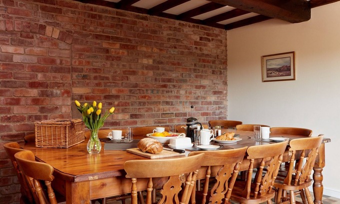 A spacious cottage designed for comfort and group stays, this six-bedroom property accommodates up to twelve guests, making it perfect for large families or gatherings of friends. With a combination of king-size and twin bedrooms, including an accessible ground-floor twin room and bathroom for guests with mobility needs, it caters to a wide range of visitors. The cozy living area features a comfortable sofa and leads to a private terrace with outdoor furniture and the option to rent a hot tub for added relaxation. While pets are not permitted, the cottage ensures a sociable, welcoming atmosphere complete with an indoor games room for shared fun. Set in the tranquil Derbyshire countryside, the cottage is ideally located for exploring the natural beauty of the Peak District. Guests can enjoy nearby walking and cycling trails or take a short drive to local attractions such as Dovedale, Carsington Water, and the historic towns of Ashbourne and Bakewell. For dining and shopping, charming cafés and markets are within easy reach. Derby train station is approximately 25 minutes away, and East Midlands Airport is accessible in under an hour, making the location both scenic and well-connected. This well-appointed property features a modern kitchen with an electric hob, double oven, and dishwasher, alongside a separate utility room with a washing machine. Additional conveniences include multiple bathrooms, some en-suite, as well as optional extras like a cot and highchair. Heating and towels are included to ensure a warm and comfortable stay.