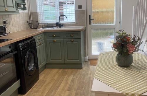 The new cottage kitchen, is located next to the lounge. With fridge freezer. Toaster, Washing machine, kettle and all kitchen essentials.