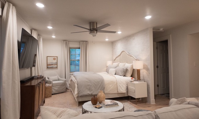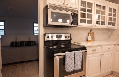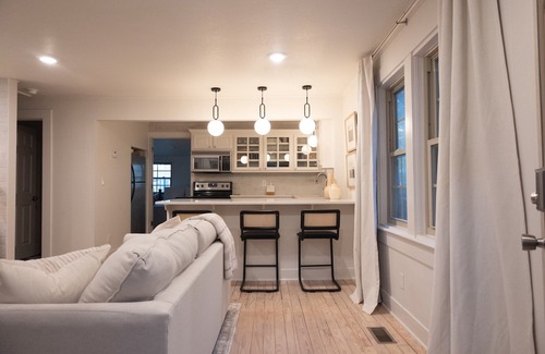 The newly remodeled Stadium Cottage is a light-filled studio home with a plus one bedroom with twin bed and a Queen pullout. The original floors and stylish design are only surpassed by its location. You will wake up in the shadow of Razorback Stadium. With a king bed, twin in the back mini bedroom, and a fold out full, you and up to four close friends can have a magical weekend in Fayetteville. A charming back porch is the perfect place to enjoy a morning cup of coffee overlooking the UofA.