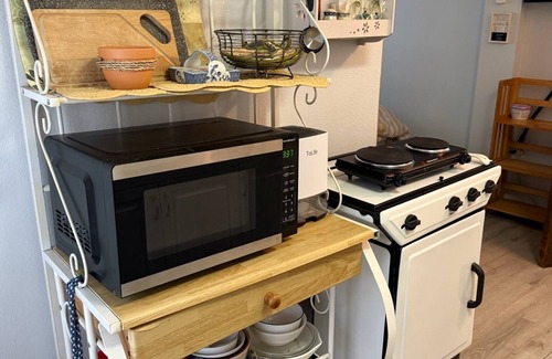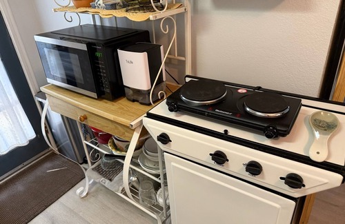 • Essential Kitchen Amenities: The kitchen is set up for preparing basic meals and includes a coffee pot, mini fridge, toaster oven, microwave, and double hot plate—perfect for quick and easy cooking during your stay.