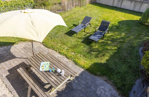 - south-facing terrace with table and parasol, deckchairs