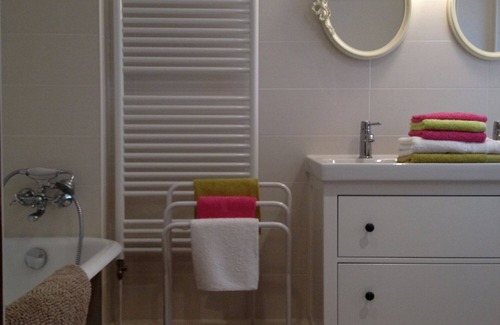 you are living in a sweet gingerbread houseatmosphere in this apparment on the second floor of the house, with two double bedrooms (1 bed 160x200 cm - 2 beds 90x200 cm), a piano, a kitchen (ceramic hob, extractor hood, oven, microwave, dishwasher, coffee maker, toaster) overlooking the dining area and a large private Terrasse of 31 squaremeters equiped with garden furniture. The bathroom is including an antique Bath, a towel rail radiator, a double sink and separate toilets
