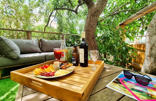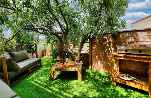 - the superb terrace on stilts like a tree house and its grass more real than nature all with exceptional views of the Albères, the roofs of Montesquieu, the Canigou and the Plaine du Roussillon. The freshness brought by the delicate shading of the leaves of the Micocoulier is an invitation to a delicious idleness or to share moments of conviviality around the dishes prepared on the plancha.