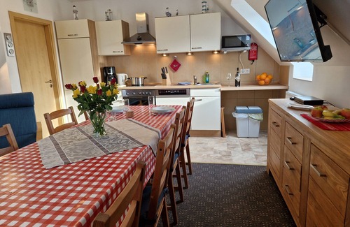 In the upper apartment a second table and enough chairs are provided. Crockery is available for 12 people in the apartment, is cleaned with the dishwasher. There is enough space for everyone in the grill pavilion.