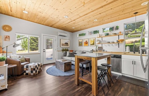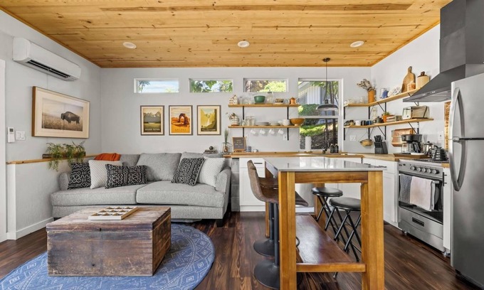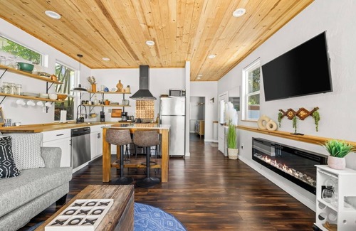 This one bedroom home has a queen bed, modern bathroom with a stand up shower, washer/dryer combo, couch with a pullout queen mattress, fully stocked kitchen, large smart TV, gas fire pit, and outdoor seating. It is easy to feel right at home!