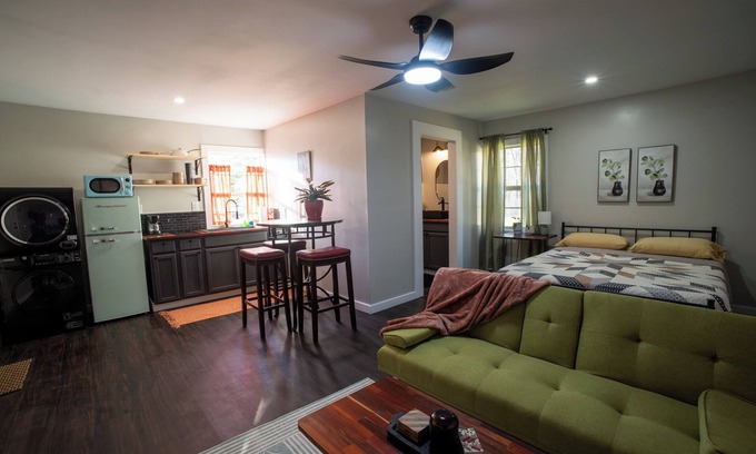 This studio unit is situated on 4 acres of peace & quiet, where you will have your own private abode nestled in nature as you listen to the owls hoot! It’s located behind our mom’s house- she won’t bother you, but will be close by if needed! We are pet friendly, just communicate it with the host beforehand- there will just be a small pet fee & pets must be trained. This studio provides a private washer, dryer, smart tv, bonfire pit, newly constructed kitchen & bath, futon, cook top, retro appliances, & queen sized bed.