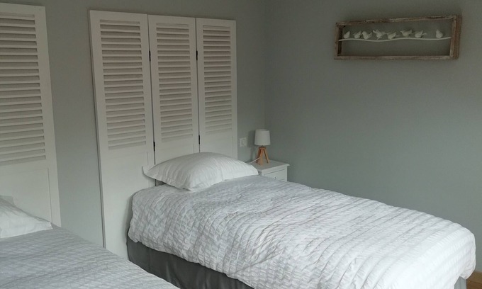 Upstairs, a first bedroom with 3 90 x 200 beds and a connected TV will welcome you in the freshness of its gray and white tones.