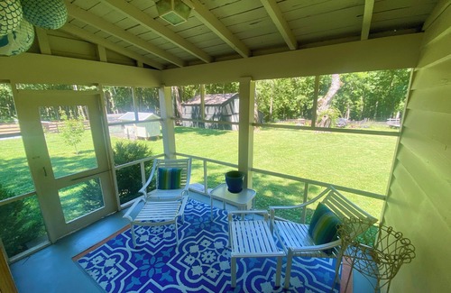 Retreat Cottage is beautifully appointed - with a mixture of antiques and modern, as well as some whimsy. The cottage is well-maintained and has a living room and dining room and full kitchen, as well as a large bathroom with full sized washer and dryer. There is a sweet bedroom with a queen size bed (if more two people, we do have self inflatable mattresses that can be used in living room for up to two additional people,). There are a front porch and small back screened porch to sit and relax and enjoy the lovely views. The back porch is quiet and sweet and overlooks the barn - and the animals.