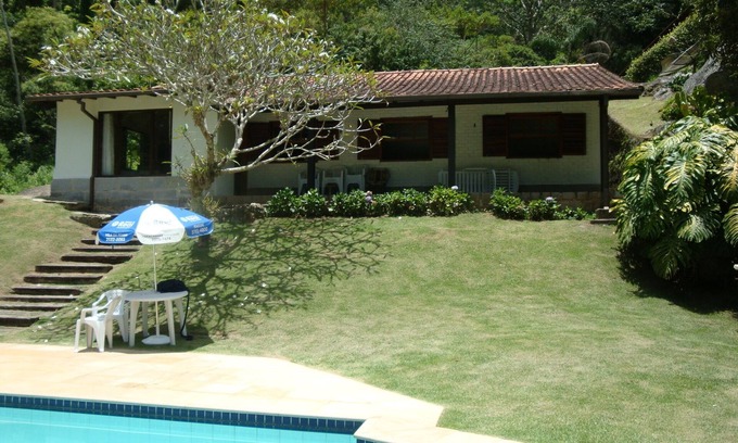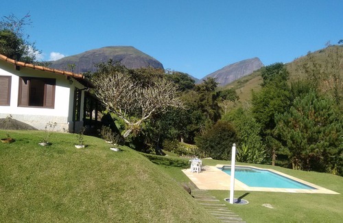 Villa in the Cuiabá Valley, overlooking the beautiful mountains of Itaipava, pleasant, comfortable, quiet place. Hiking, mountain biking or just relaxing. Three bedrooms, one en suite, ceiling fans, airy and cozy. Room with three environments, Fireplace, TV, Dvd, overlooking the pool and gardens. Balcony with hammocks. Barbecue separate from the house with 06 burner stove, countertop, sink, toilet. Cup / Kitchen with fridge, 5 burner stove, microwave, toaster, blender, coffee maker, orange juicer, plates, glasses, cutlery, cups, mugs, tablecloths and dishes.
