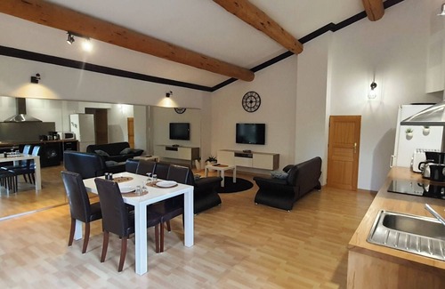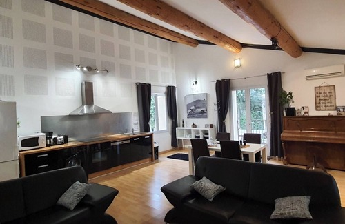 Rent superb new and fully equipped gite located 2 kms from Bedoin in a converted barn, composed of 2 bedrooms with tv, 1 bathroom and a large living dining room with
