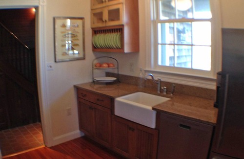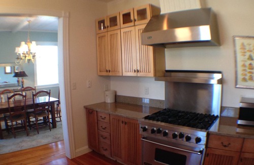Recently renovated kitchen with Viking stove, granite counter tops and large farm sink that connects to country style dining room.