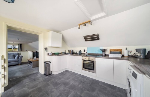 Ascend to the first floor, where the reverse-level design truly shines. The open-plan living and dining area is bathed in natural light, offering panoramic countryside vistas with enchanting sea glimpses on clear days. Cozy up by the wood-burning stove on cooler evenings or gather around the Smart TV for a family movie night. The sleek, fully equipped kitchen is a joy to cook in, whether you’re preparing a hearty breakfast before heading out to explore or a special dinner to savour together.