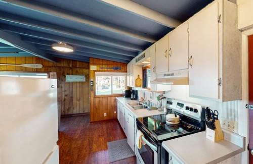 This home has an open floor plan with a living area, a kitchen space, and a single bedroom. Well appointed with comfortable furnishings and maritime decor, the space is bright and inviting with numerous picture windows, knotty pine paneled walls, and wood beam ceilings reminiscent of a ship's hull.
