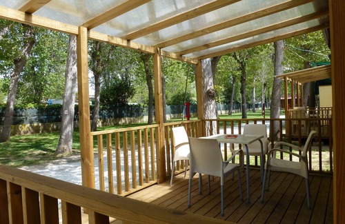 Location: This beautiful holiday accommodation is located in a lovely campsite near Viareggio. We are in the heart of Versilia, only 800 metres from the sea (free shuttle available from 01.06-10.09), near the historic Lake Puccini and not far from art cities such as Lucca, Pisa, Florence and Siena. The campsite is surrounded by a vast pine forest and is 1500 m from the town centre and only 800 m from the sea, which can be reached via an avenue through the unspoilt pine forest. Covering an area of 30,000 square metres, it offers its guests an excellent restaurant, a pizzeria, a bar and a TV room with Internet access as well as a well-stocked shop, in addition to hygienic amenities.1 swimming pool (with swimming cap only) 10 x 20 metres and 1.10 to 1.40 metres deep, equipped with sun loungers and parasols and 1 children's pool 4 x 2 metres in size / 30 cm deep, barbecue area for the community are available to guests from 1 June to 10 September. Facilities: The campsite has 16 new brick-built flats. These are typical beautiful cottages with a veranda and a forecourt for bicycles and pushchairs. Fully equipped kitchen with dining table and TV.