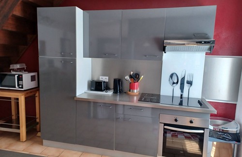 On the ground floor: a large living room with integrated kitchen including a fridge, hob, oven, dishwasher and microwave a washing machine and all equipment for 6 people.