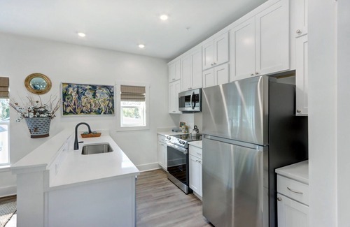 Our tastefully appointed residence is the ideal choice for group getaways, offering comfortable accommodations for up to four guests with two Queen Beds. The primary bathroom boasts a double vanity and a luxurious walk-in rain shower, ensuring a pampering experience during your stay. You'll enjoy all of the modern conveniences one could ask for - smart TV's, a comfortable gathering space, and a full kitchen equipped with all essentials needed for home cooked meals.