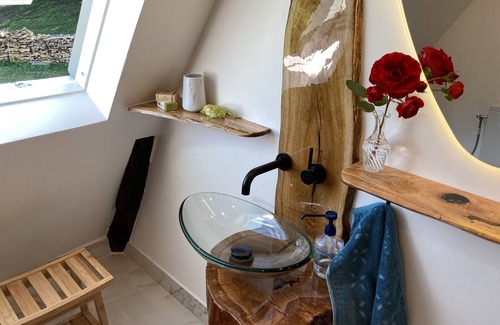 Offers panoramic mountainous forest views from the Le Goul valley surrounded by national parks. An early nineteenth century newly renovated farmhouse, it is spacious, light, warm in winter and cool in summer. It has a unique blend of original build characteristics and modern fixtures. The house is set within charming buildings of this disused farm owned by your hosts Sas and Tony .