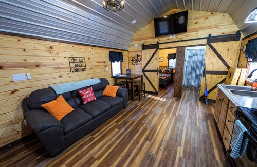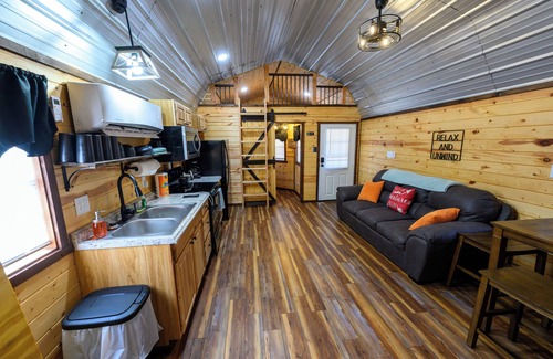 The cabin features a cozy ambiance with a spacious living area that invites you to unwind after a day of exploring. With a queen bedroom, a bunk bed room, and a loft it comfortably accommodates up to 8 guests, ensuring everyone has a restful place to recharge. The thoughtfully designed layout includes a pullout couch in the living area, providing additional sleeping space for larger groups.
