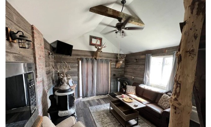First off this is in the country 5 miles of gravel road. We have a small living area, loft w two full sized beds, pullout couch (queen) full bath, kitchenette (microwave, full refrigerator, griddle, keurig, crockpot and outdoor grill).